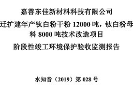 公?? 示??? 根據(jù)《國務院關于修改〈建設項目竣工環(huán)境保護管理條例〉的決定》(國務院令第682號),以及環(huán)保部《關于發(fā)布的公告》(國環(huán)規(guī)環(huán)評[2017]4號),現(xiàn)將嘉善東佳新材料科技有限公司遷擴建年產鈦白粉干粉12000噸,鈦白粉母料8000噸技術改造項目階段性竣工環(huán)境保護